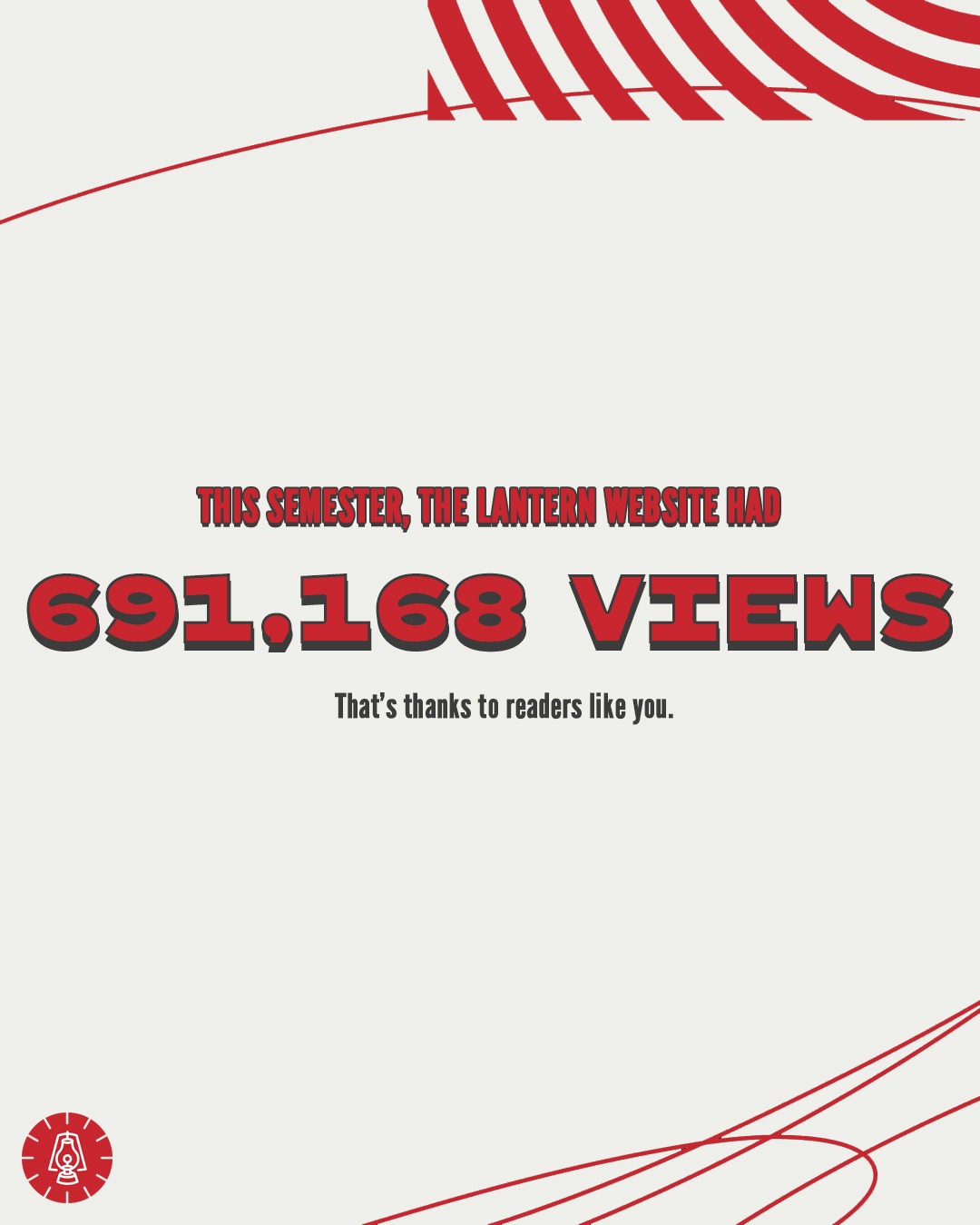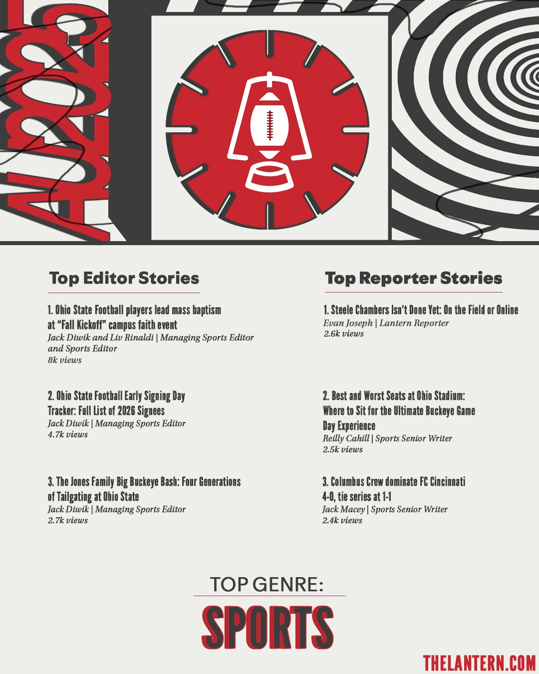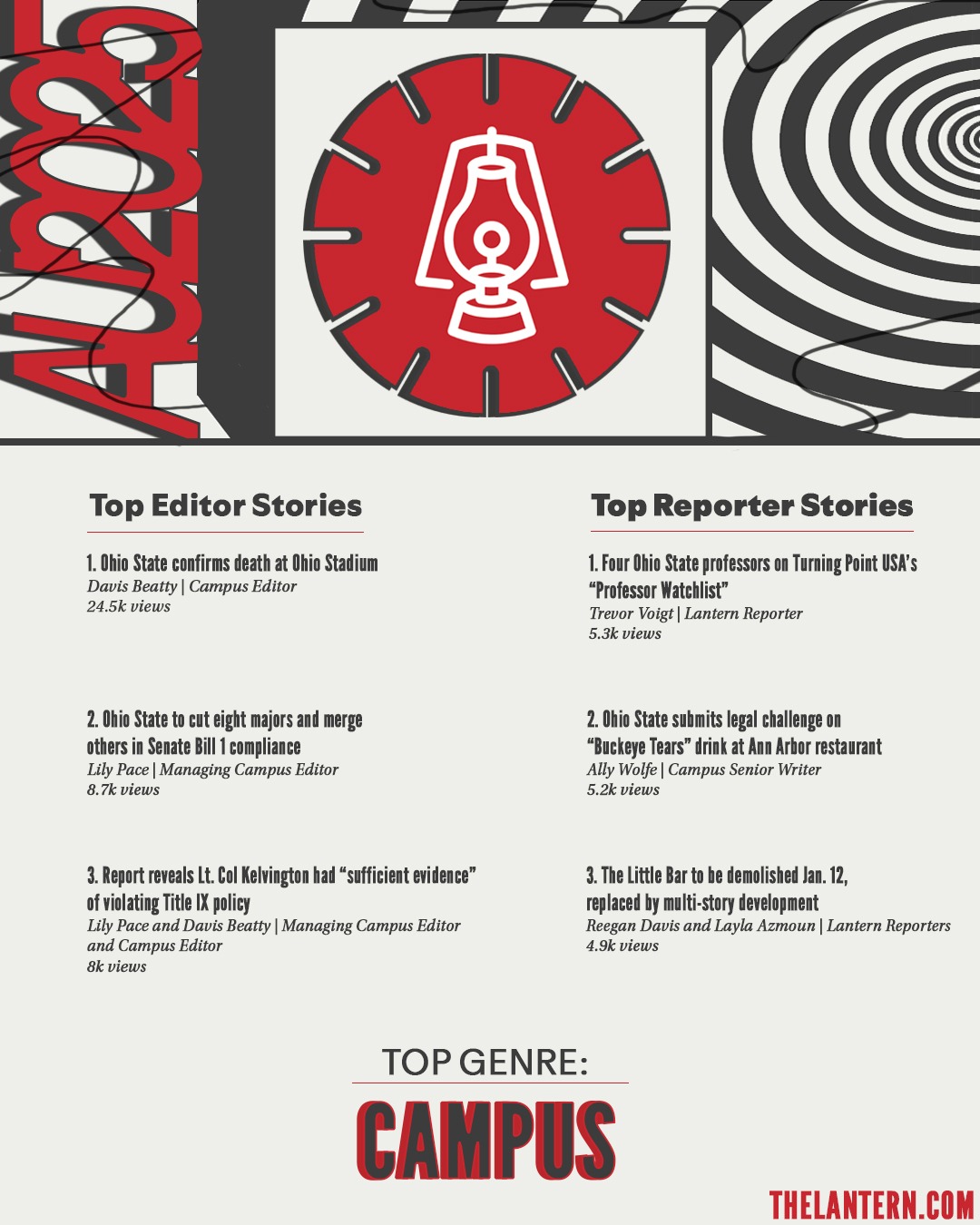 For The Lantern, I created a series of graphics going over our analytics for the semester. This project was inspired by Spotify's 2025 Wrapped, specifically the 2025 style.