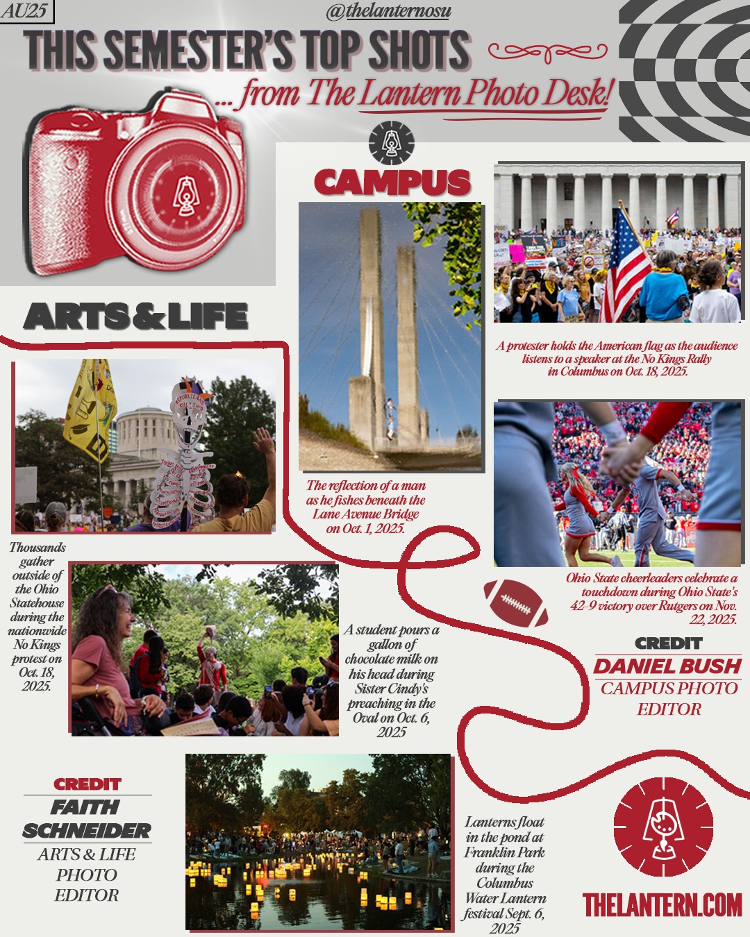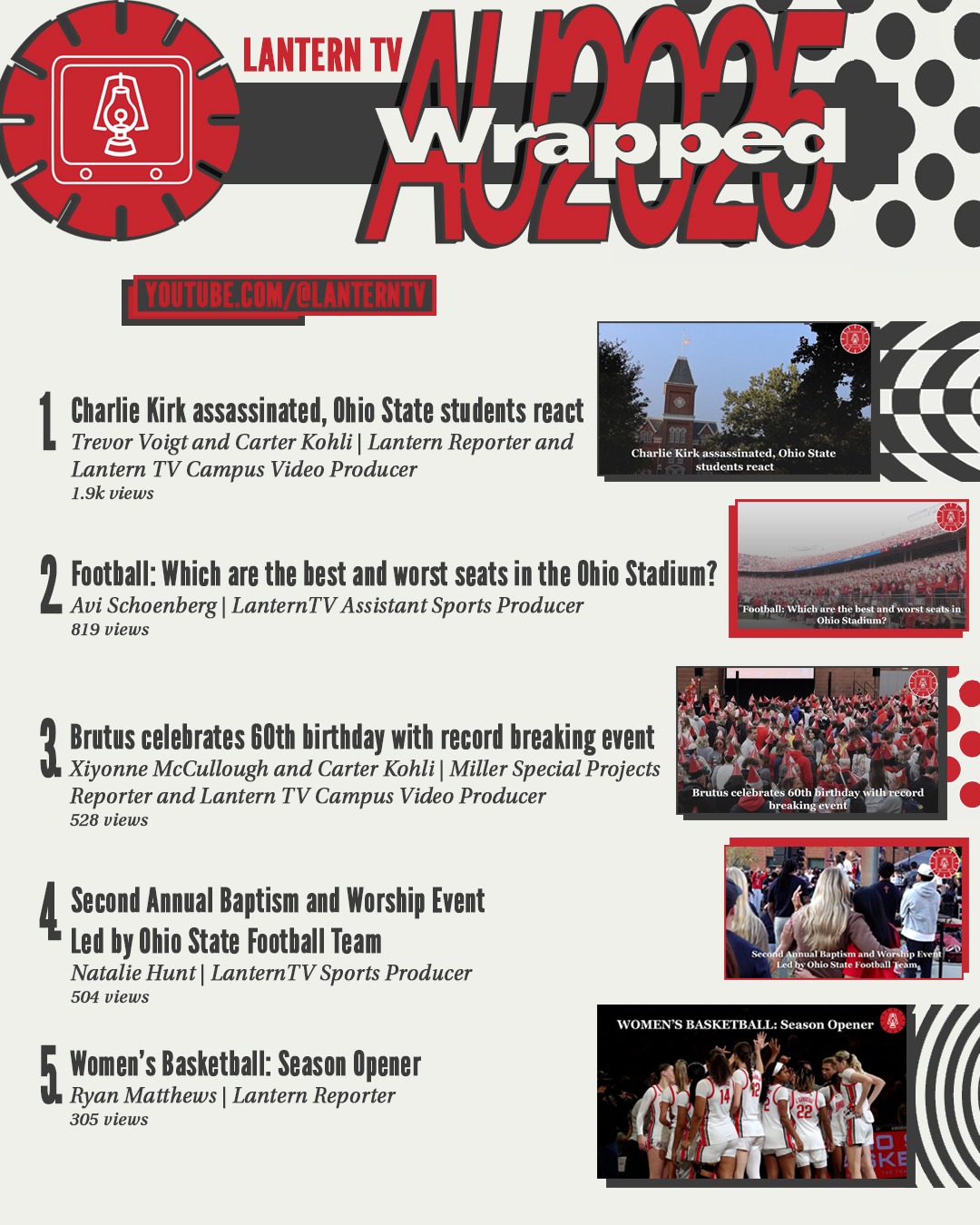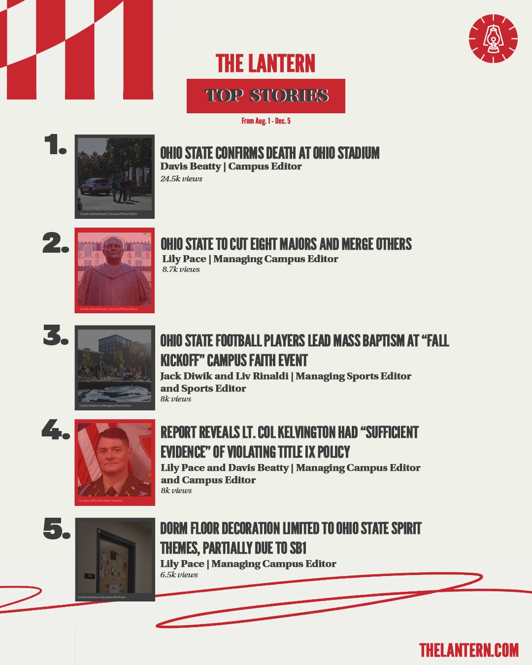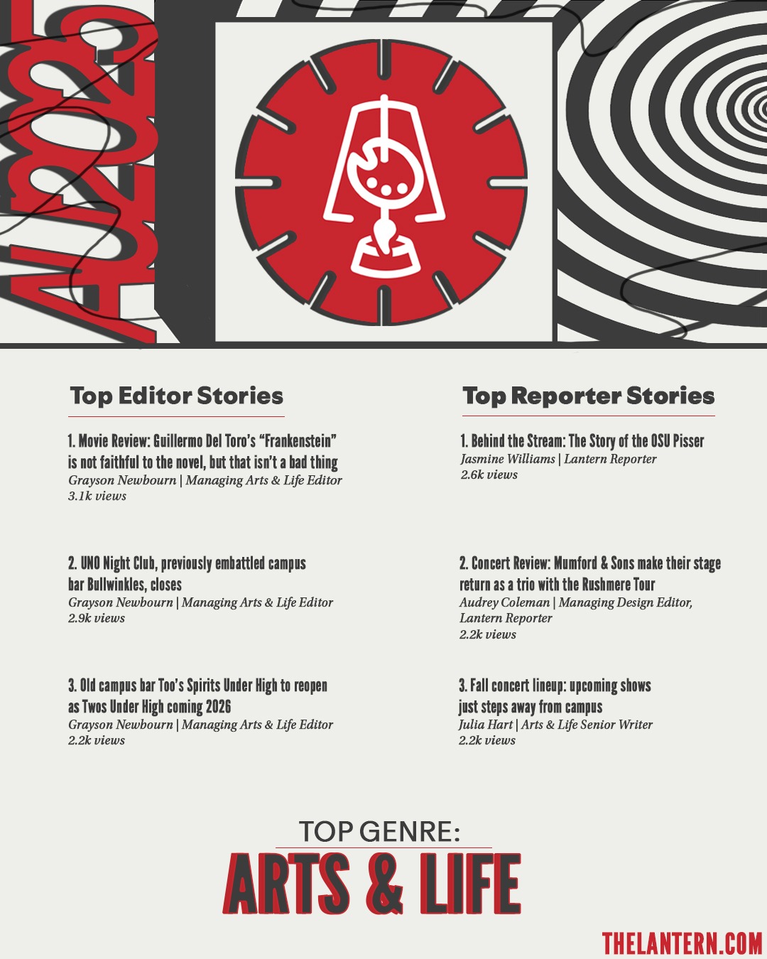 For The Lantern, I created a series of graphics going over our analytics for the semester. This project was inspired by Spotify's 2025 Wrapped, specifically the 2025 style.